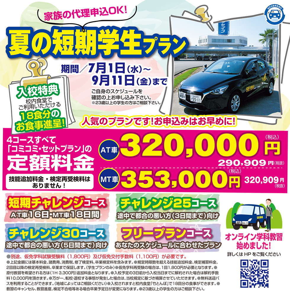 ●規定時限数を超える技能追加料金、検定補習料金、2回目以降の検定再受験料、卒業まで保証します(学生プランのみ)。